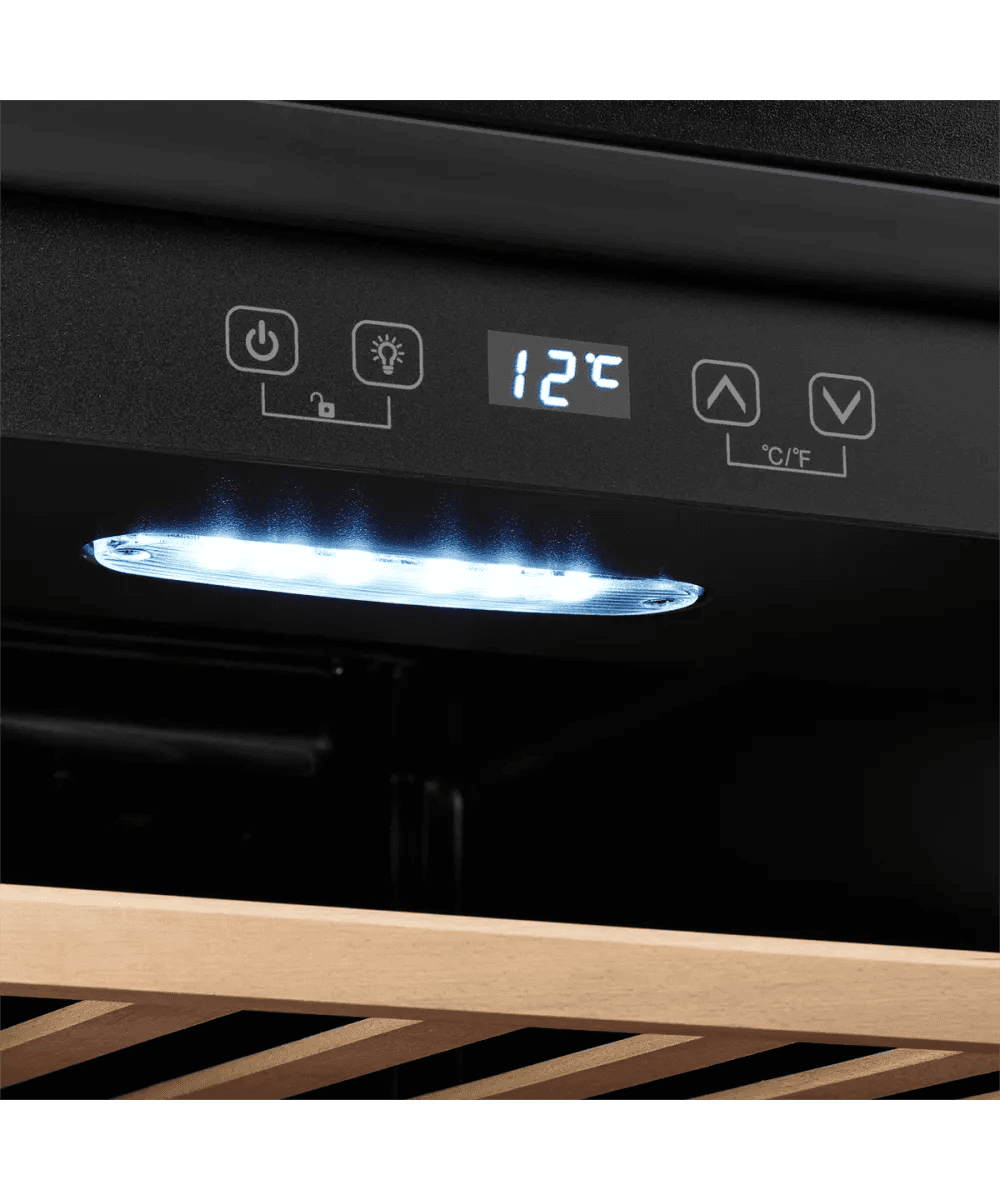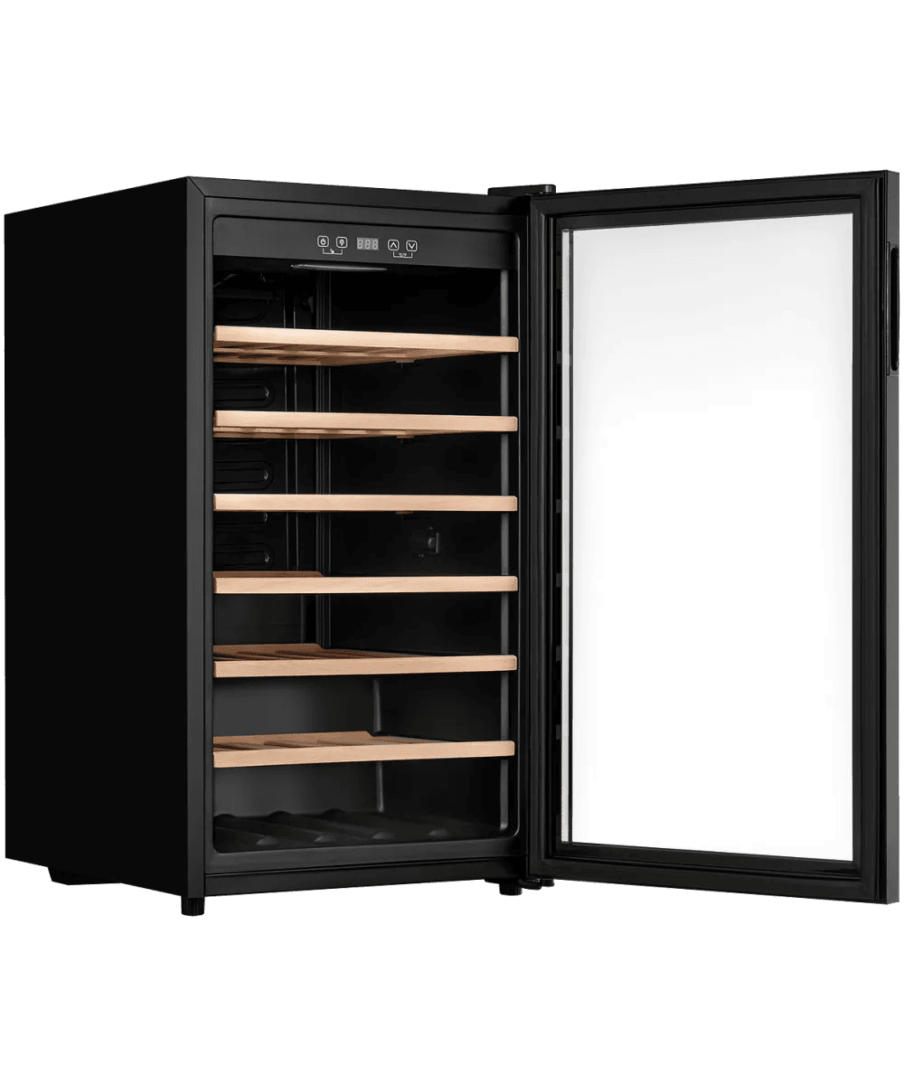 - Винный шкаф KUPPERSBERG/ Винный шкаф KUPPERSBERG, отдельностоящий, High-Tech, объем 128 л, вместимость 40 бутылок, диапазон температуры 5-20 градусов, механическое открытие двери, 6 полок из бука, LCD дисплей, уровень шума 38 дБ, цвет черный